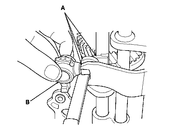 1. Measure the clearance between each shift fork (A) and its matching synchro sleeve (B). If the clearance exceeds the service limit, go to step 2.