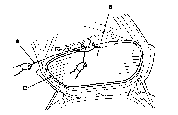 6. With a helper on the outside, pull the piano wire (A) back and forth in a sawing motion. Hold the piano wire as close to the rear window (B) as possible to prevent damage to the tailgate, and carefully cut through the adhesive (C) around the entire rear window.