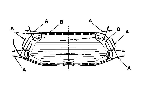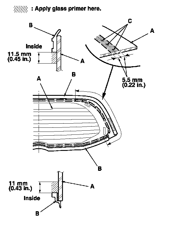 11. Apply glass primer to the inside face of the rear window (C) as shown, and let the primer dry, then attach rubber dams A and B with adhesive tape to the inside face of the rear window.