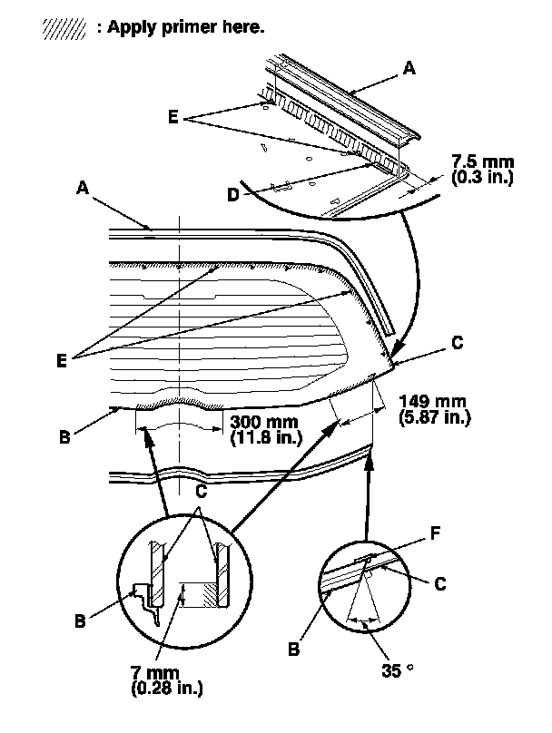 - Apply the glass primer to both side portions of the rear window, using the printed dots (C) on the rear window as a guide.