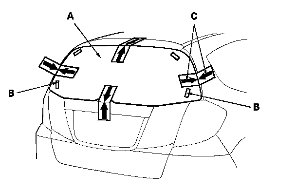 13. Attach fasteners A and B with adhesive tape to the inside face of the rear window (C) as shown.