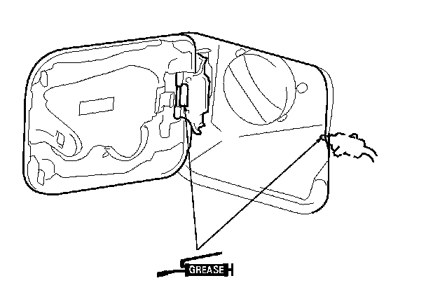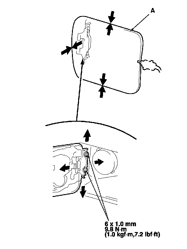 2. Adjust the fuel fill door (A) in or out until it's flush with the body, and up or down as necessary to equalize the gaps.