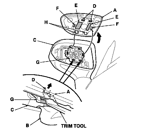 2. Put a shop towel (B) in the opening between the lower edge of the mirror holder and the mirror housing (C) to prevent scratches, and detach the bottom clips (D) with a trim tool.