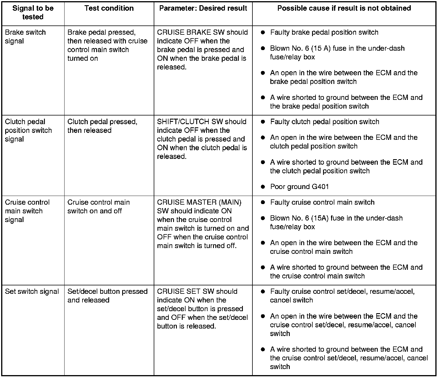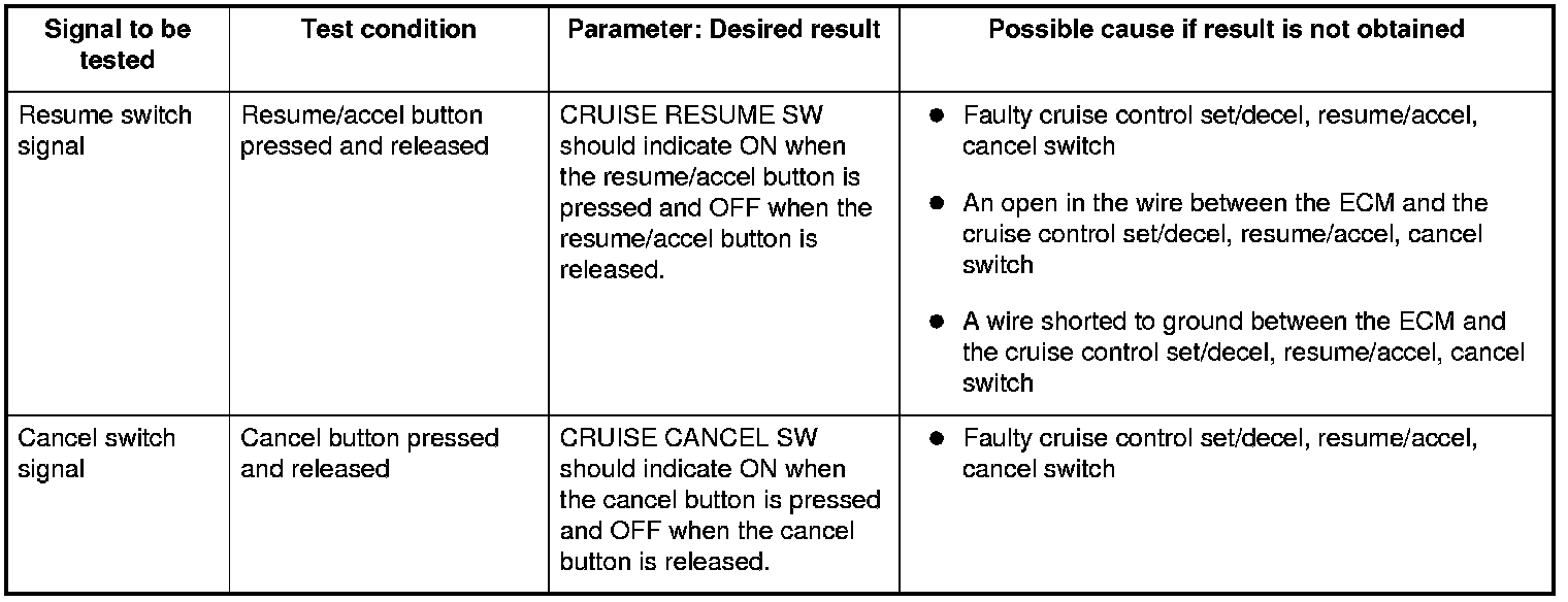 NOTE: Intermittent failures are often caused by loose circuit connections. While monitoring cruise control inputs, flex the circuit wires, and note if any of the test results change.