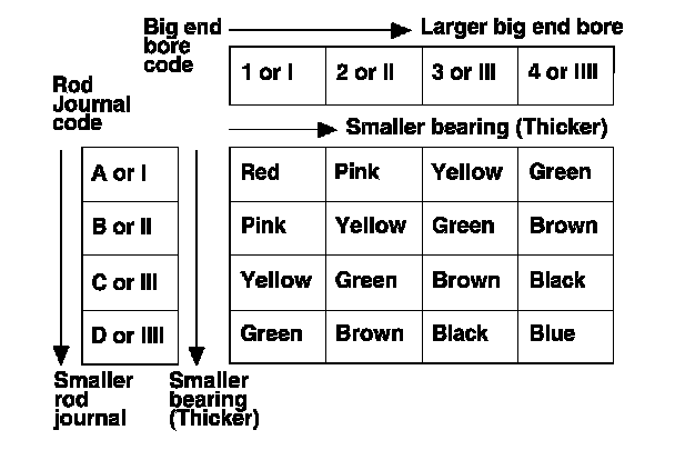4. Use the big end bore codes and the rod journal codes to select appropriate replacement bearings from the following table.