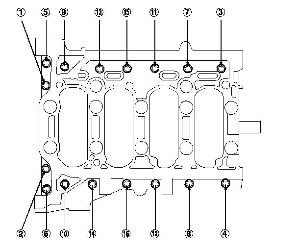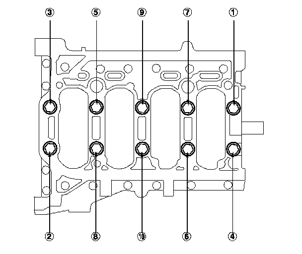5. Remove the bearing cap bolts. To prevent warpage, loosen the bolts in sequence 1/3 turn at a time; repeat the sequence until all bolts are loosened.