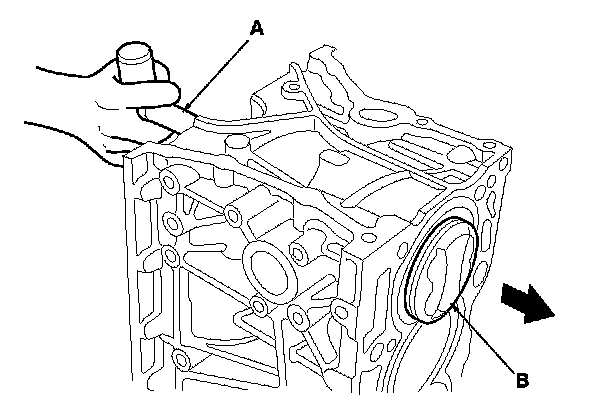 9. Use the wooden handle of a hammer (A) to drive out the pistons (B).