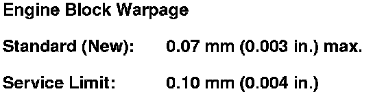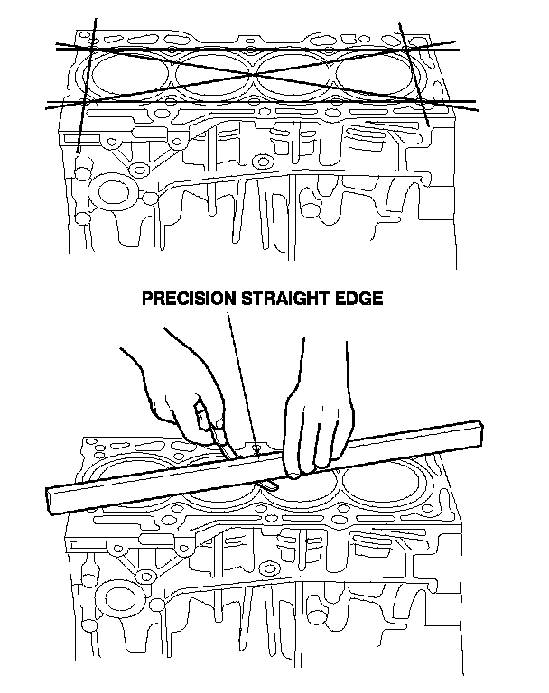 11. Check the top of the engine block for warpage. Measure along the edges and across the center as shown.