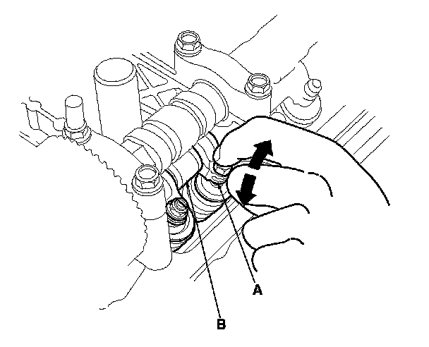4. Move the secondary rocker arm (A) for No. 1 cylinder. The secondary rocker arm should move independently of the mid rocker arm (B).
