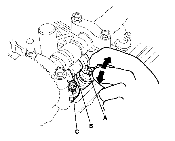 13. With the specified air pressure applied and the piston at TDC, move the secondary rocker arm (A). The mid rocker arm (B), the primary rocker arm (C), and the secondary rocker arm should move together.