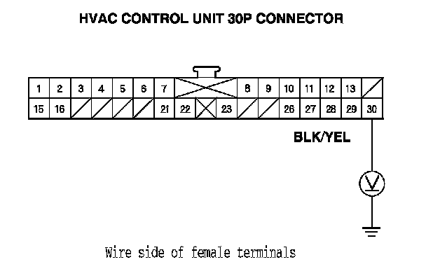 6. Measure the voltage between HVAC control unit 30P connector terminal No. 29 and body ground.