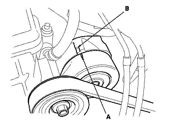 2. Check that the indicator (A) on the auto-tensioner housing is not beyond the edge of the indicator rib (B) on the tensioner base. If it is beyond the edge of the indicator rib, replace the drive belt. Service and Repair