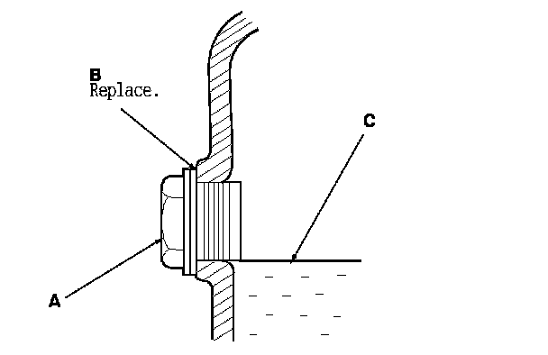 2. Remove the filler plug (A) and the sealing washer (B), then check the condition of the fluid, and make sure the fluid is at the proper level (C).