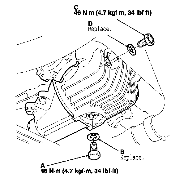 6. Reinstall the filler plug (C) with a new sealing washer (D).