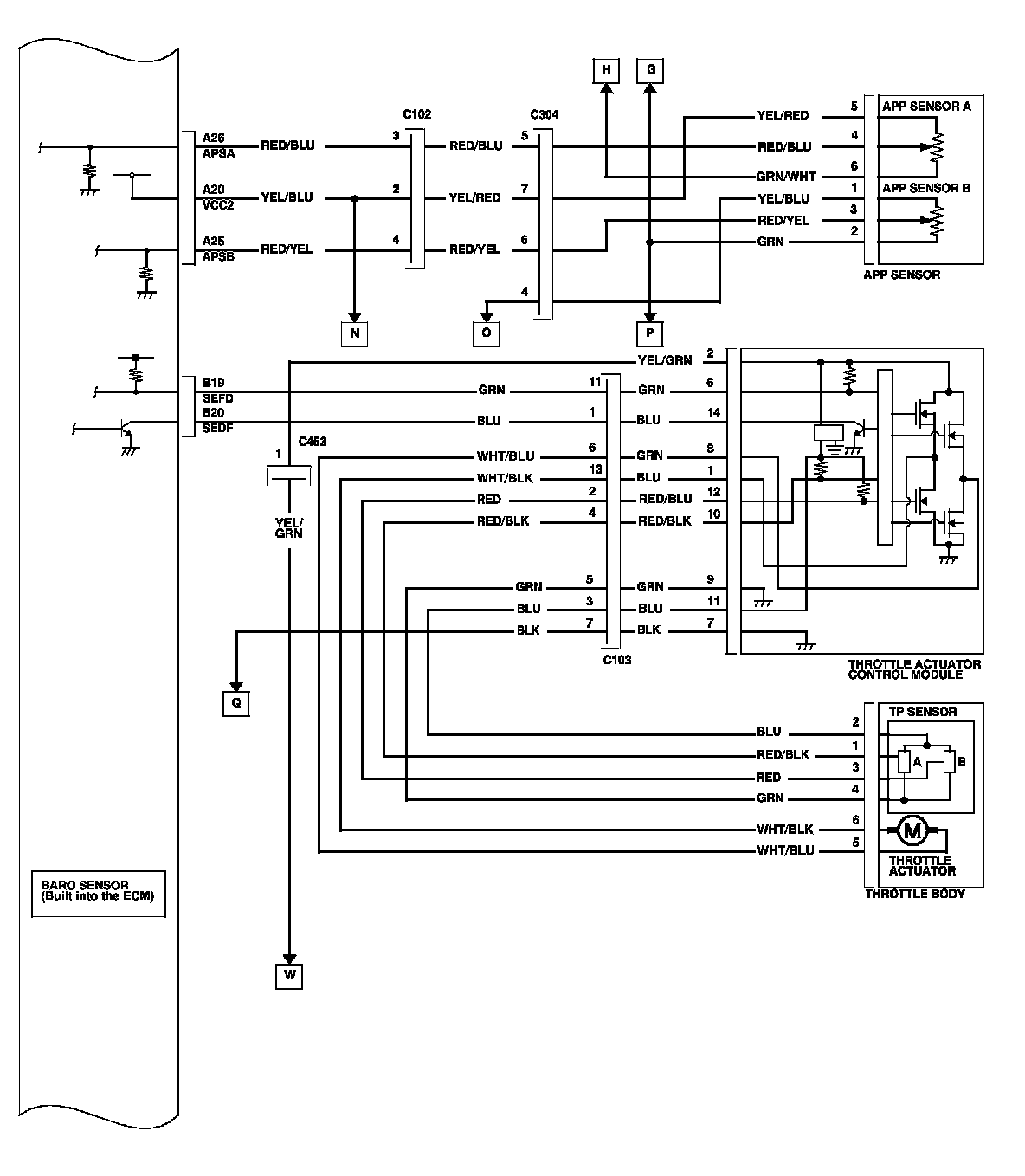 The electronic throttle control system consists of the throttle actuator, throttle position (TP) sensor A/B, accelerator pedal position (APP) sensor A/B, the throttle actuator control module, and the ECM.