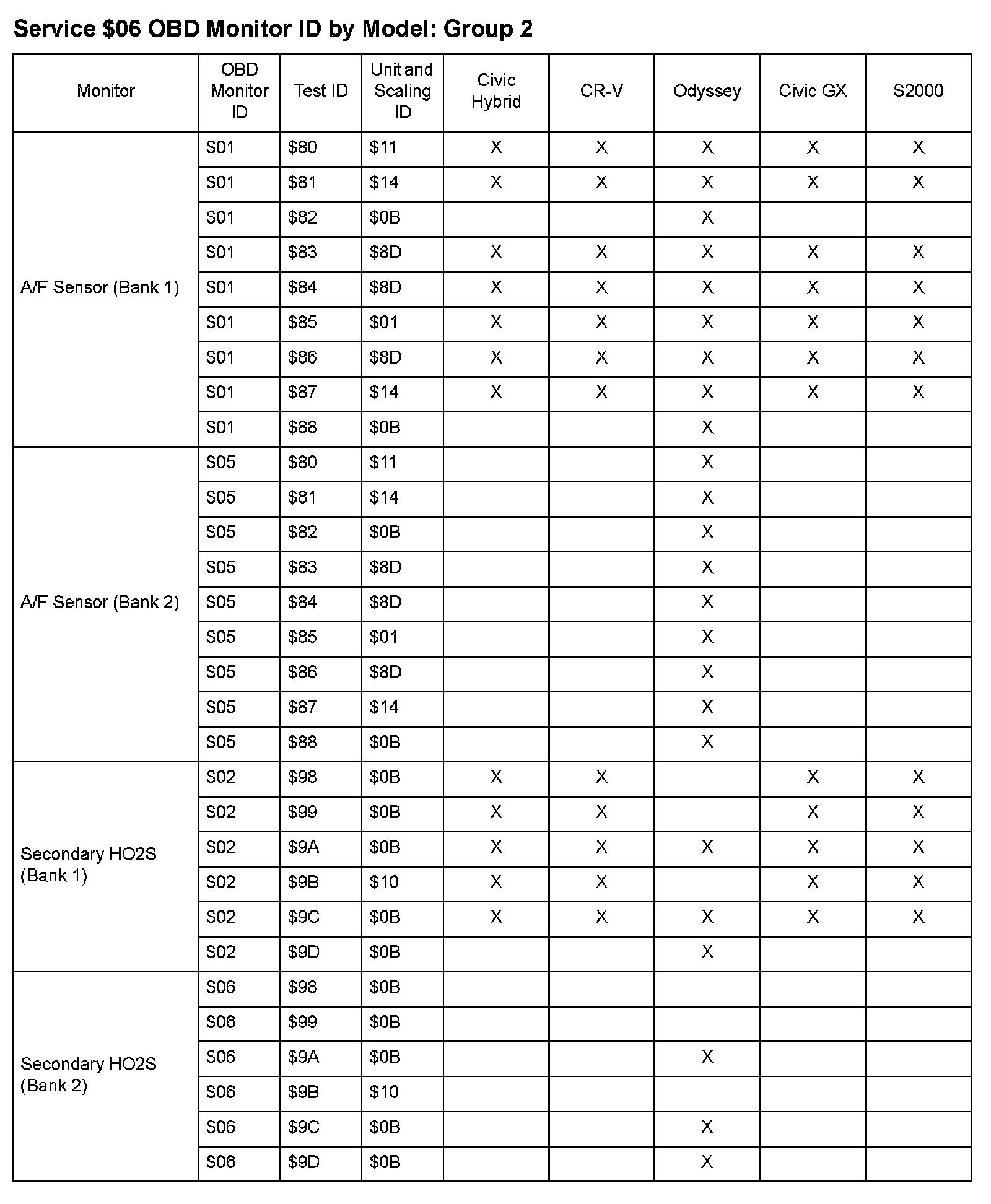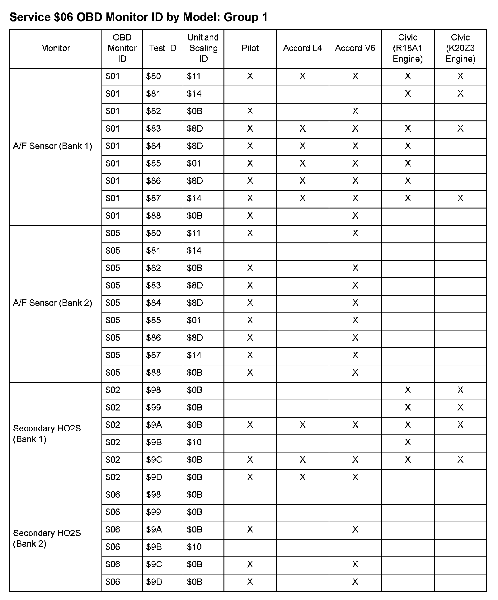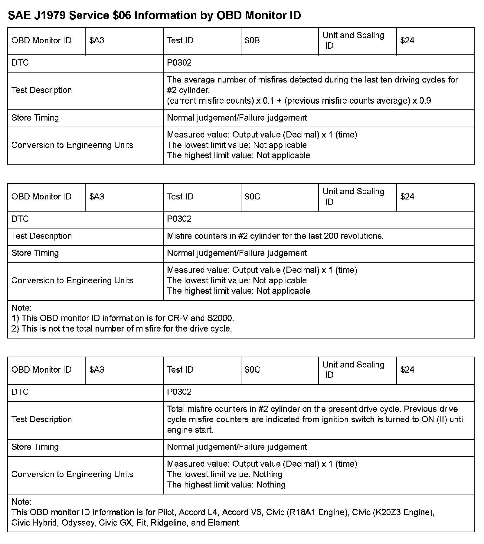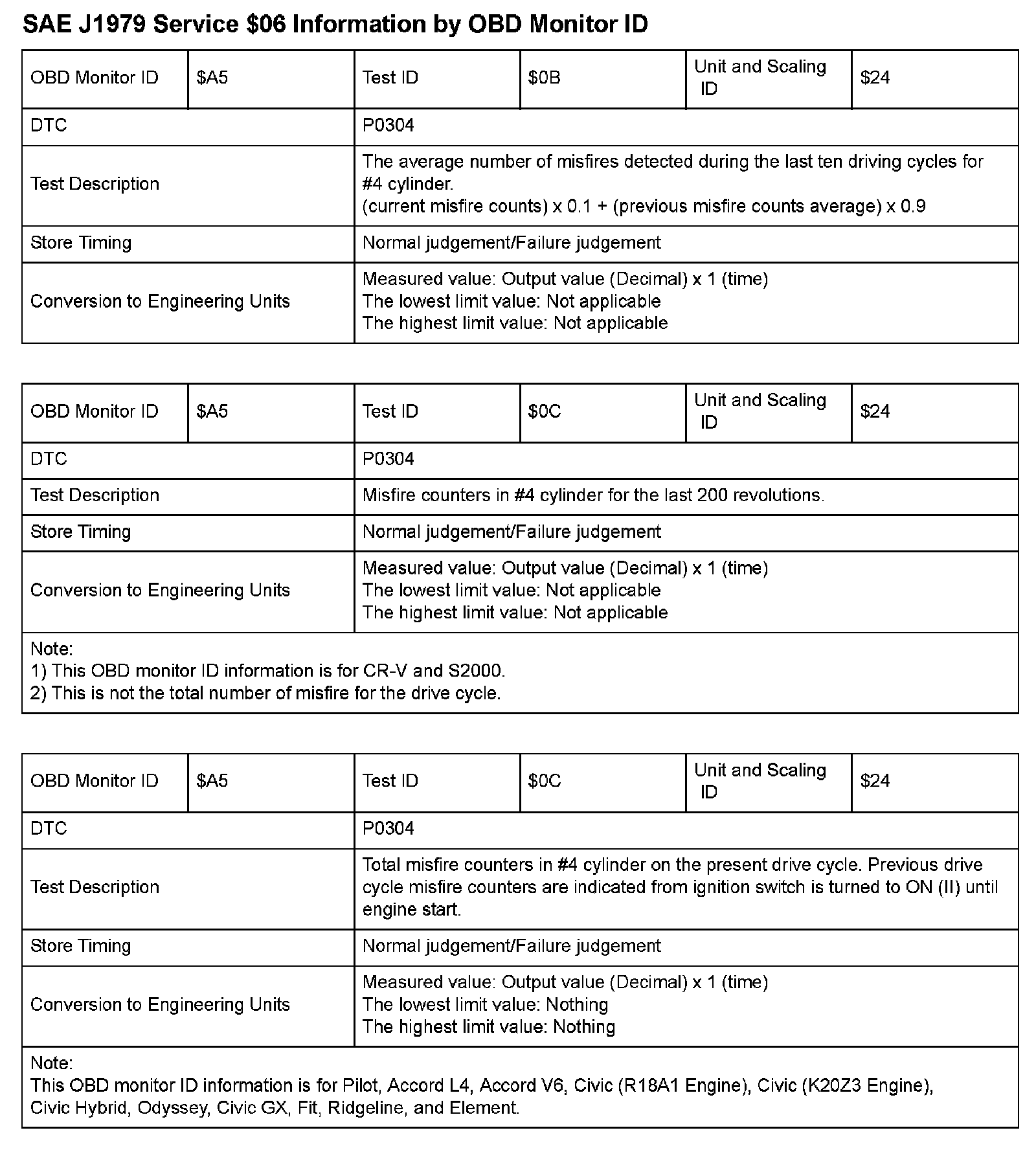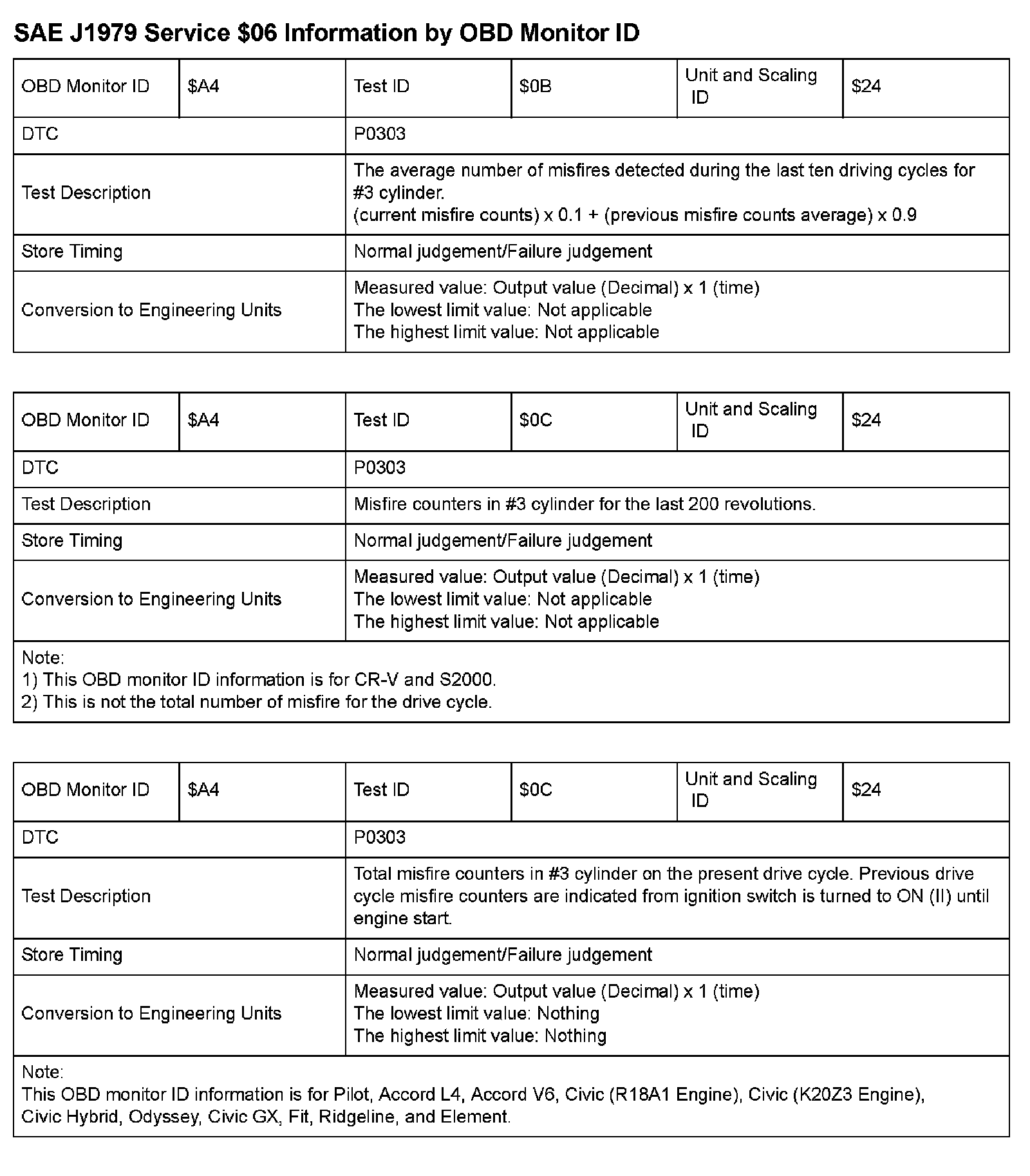 SAE J1979 Mode/Service $06 Test Information: All 2009 Hondas