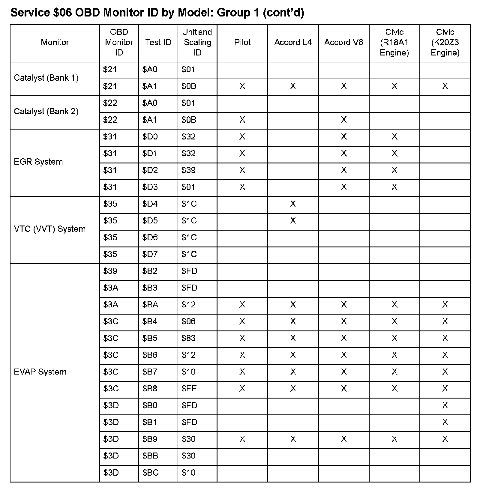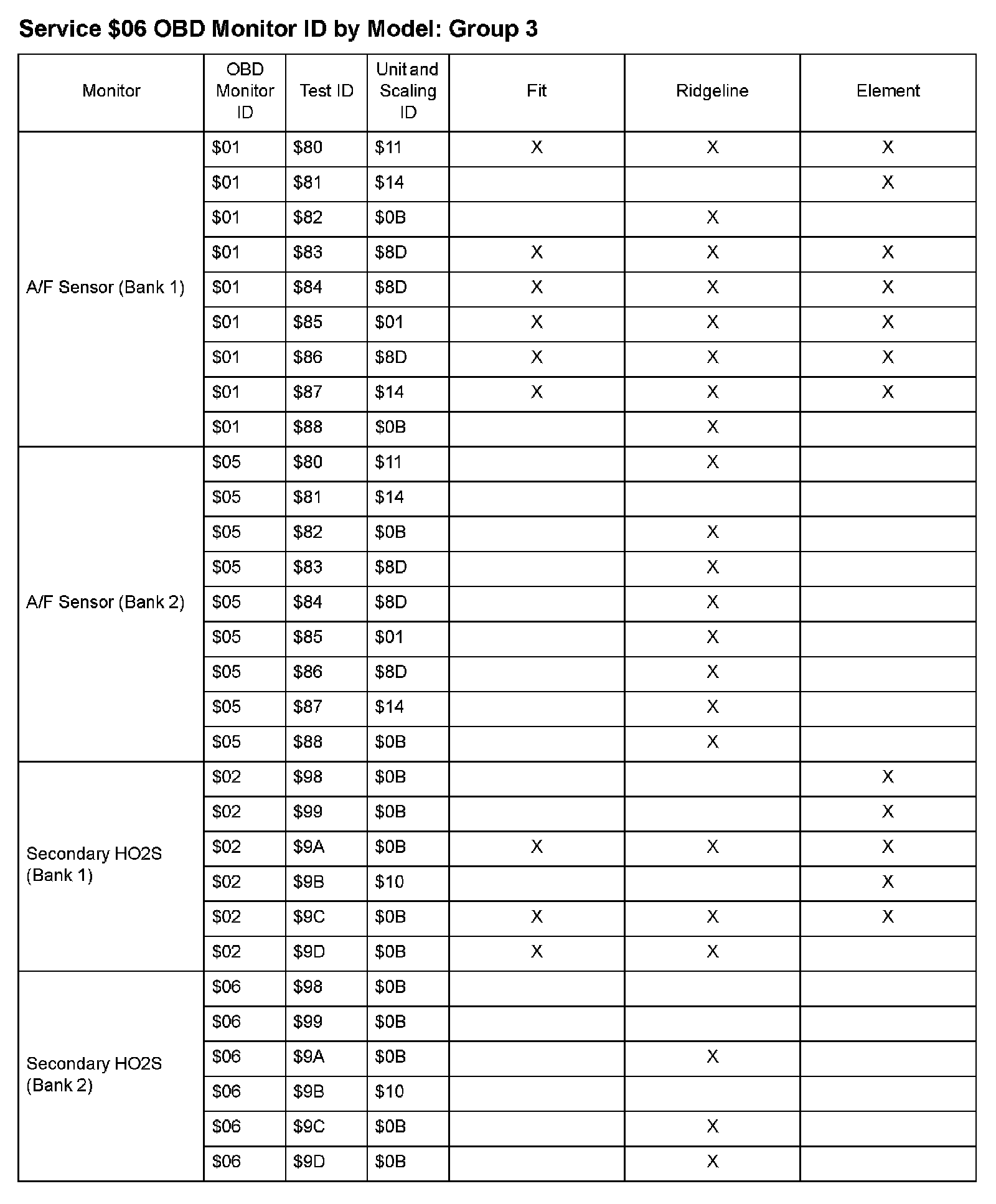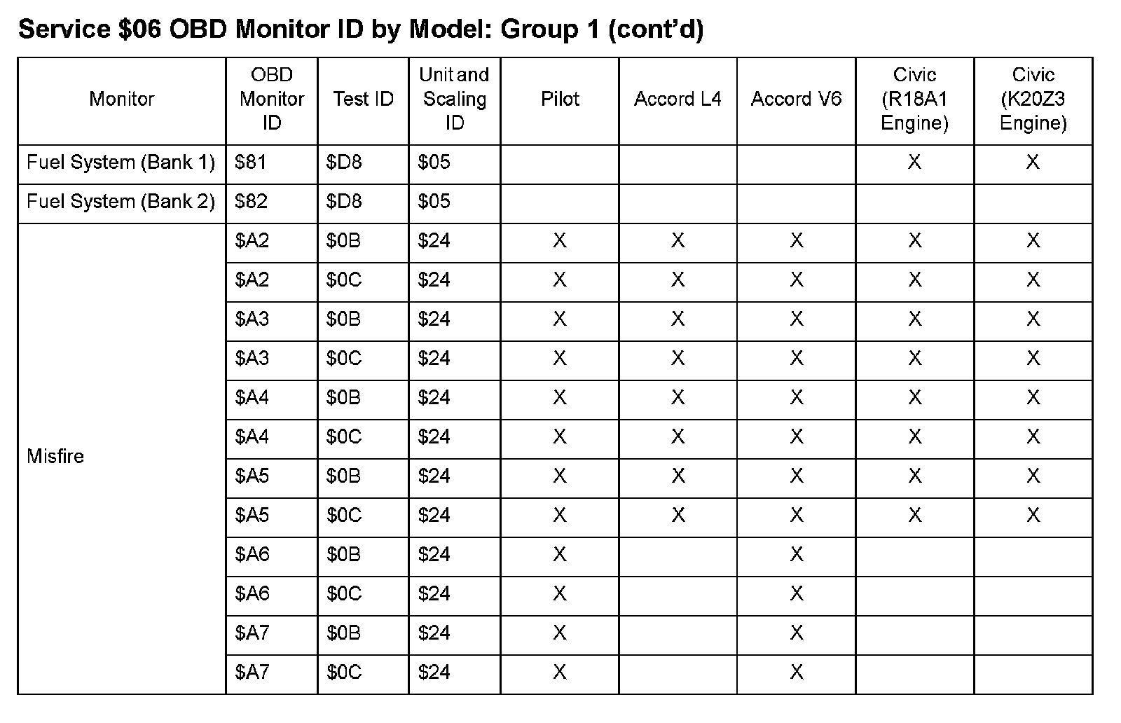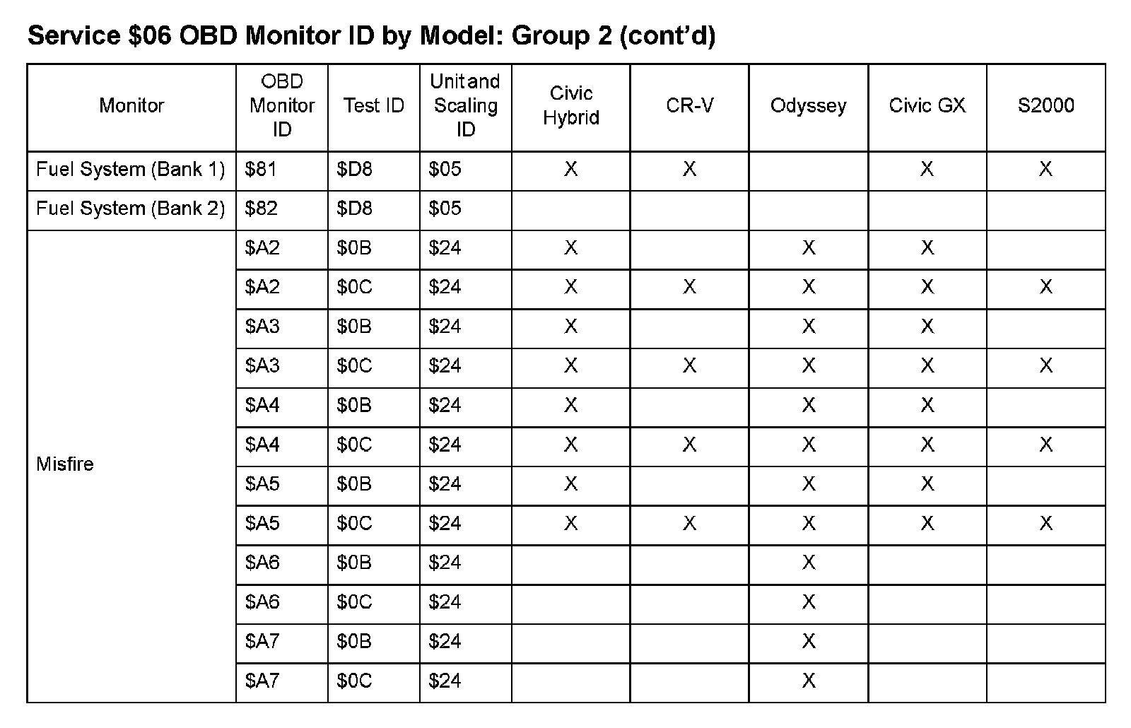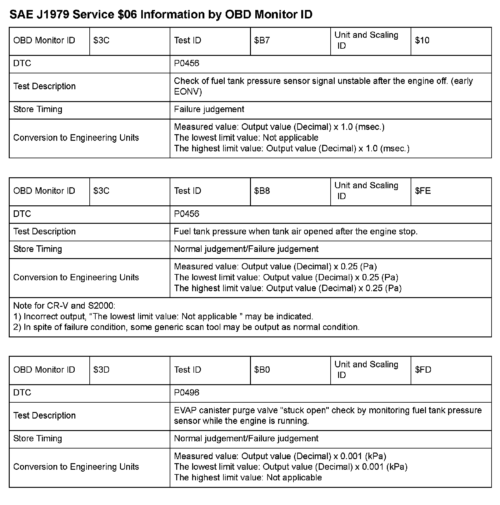 SAE J1979 Mode/Service $06 Test Information: All 2009 Hondas