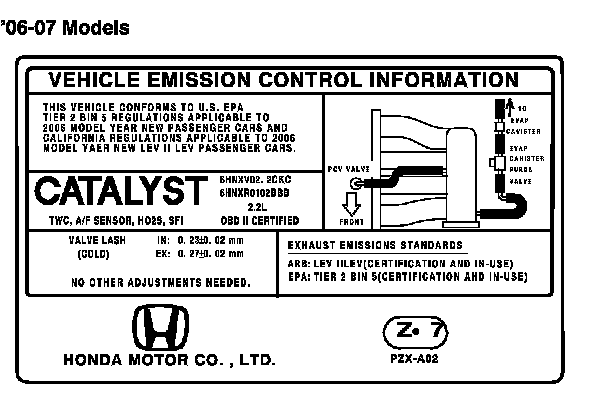 THIS VEHICLE CONFORMS TO U.S. EPA TIER 2 BIN 5 REGULATIONS APPLICABLE TO 2007 MODEL YEAR NEW PASSENGER CARS AND CALIFORNIA REGULATIONS APPLICABLE TO 2007 MODEL YEAR NEW LEV II LEV PASSENGER CARS.