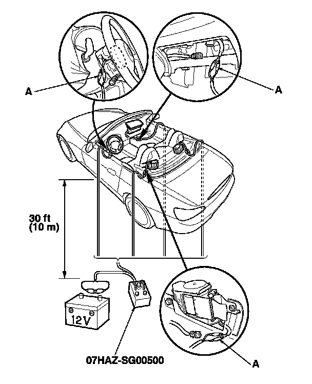 12. Cut off the airbag or seat belt tensioner connector, strip the ends of the airbag wires and seat belt tensioner wires (A), and connect the deployment tool alligator clips (A) to the airbags and seat belt tensioners.