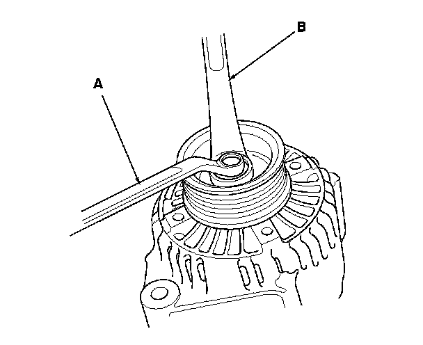 3. If the front bearing needs replacing, remove the pulley locknut with a 10 mm wrench (A) and a 22 mm wrench (B). If necessary, use an impact wrench.