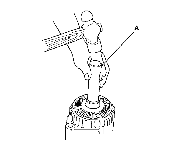 16. Support the stator drive-end housing in a vise, and drive out the front bearing with a brass drift (A) and hammer.