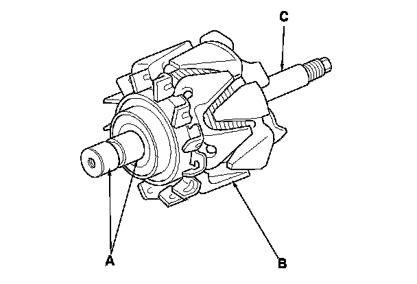 21. Check for continuity between each slip ring and the rotor (B) and the rotor shaft (C).