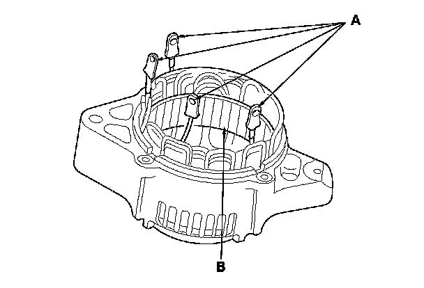 10. Remove the four insulators (A), the rear housing (B), and the washer (C).