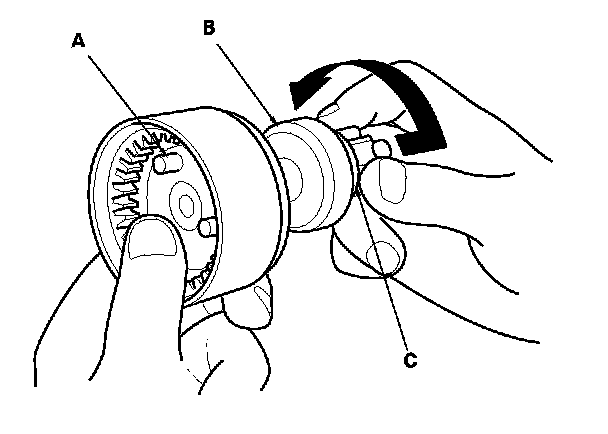 18. Hold the planetary gear shaft (A), and turn the overrunning clutch assembly (B) both ways. If it does not lock in either direction or it locks in both directions, replace it.