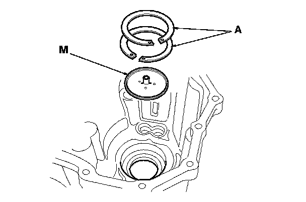 2. Install oil guide plate M and the 82 mm shim(s) (A) into the transmission housing.