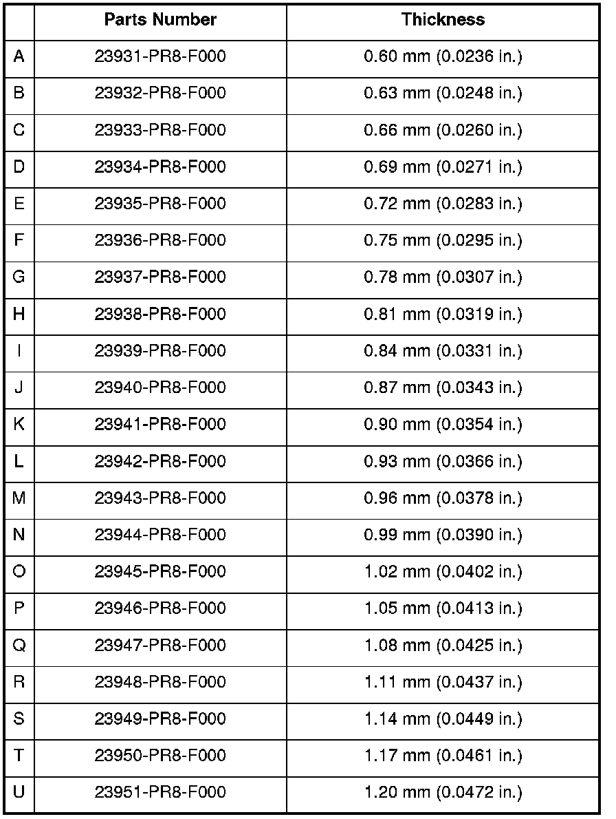 9. If the reading is within the standard, the clearance is correct. If the reading is not within the standard, select the appropriate shim needed from the table, and recheck the shim thickness.