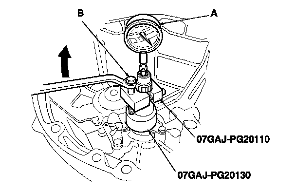 8. Turn the catch adapter bolt (B) clockwise; stop turning when the dial gauge has reached its maximum movement. The reading on the dial gauge is the amount of mainshaft end play.