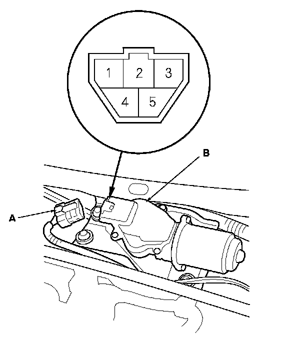 3. Disconnect the 5P connector (A) from the wiper motor (B).