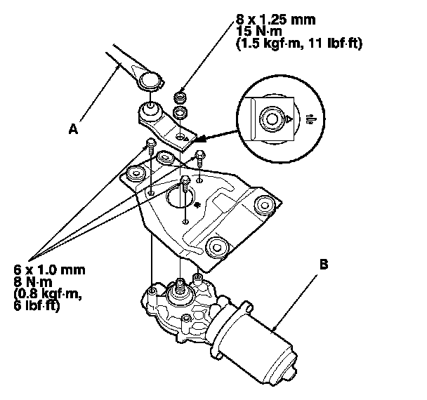 5. Remove the three mounting bolts and nut from the wiper linkage (A) to remove the wiper motor (B).