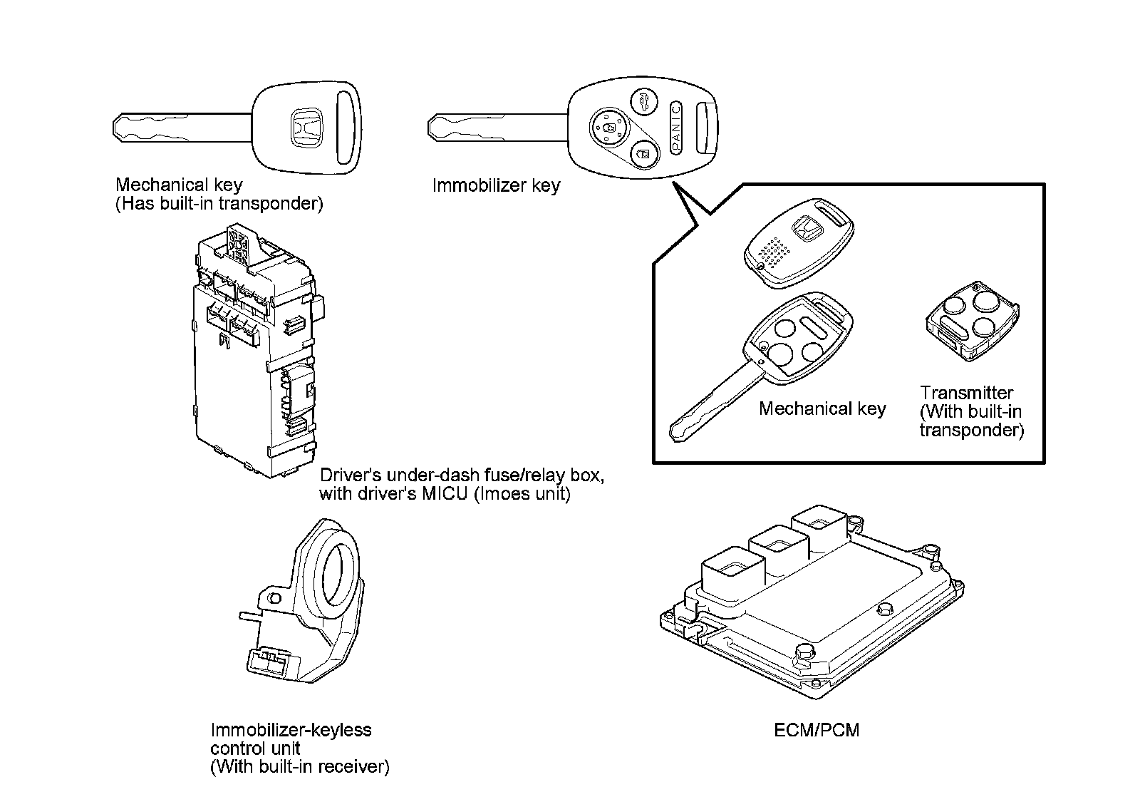 When the immobilizer key (programmed by the HDS) is inserted into the ignition switch and turned to ON (II), the immobilizer-keyless control unit sends power to the transponder. The transponder then sends a coded signal back to the immobilizer-keyless control unit which then sends a coded signal to the ECM/PCM and the driver's MICU (imoes unit).