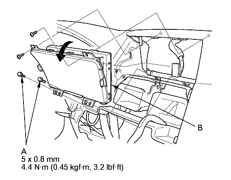 1. Remove the audio unit Audio Unit Removal/Installation (With Navigation), then remove the center display visor Dashboard Center Display Visor Removal/Installation (Without Navigation).