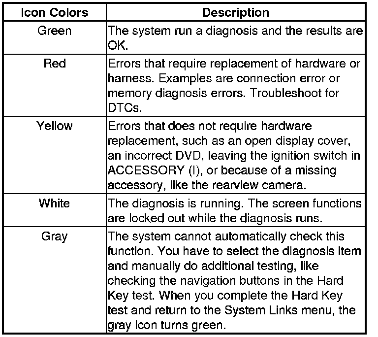 When the diagnosis finishes, the icons turn different colors based on their test status. The color definitions are shown below and can also be seen by selecting Help on the System Links screen.