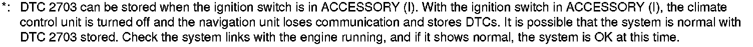 - DTC 1501 and/or 2703 can be stored when the ignition switch is at ACCESSORY (I). With the ignition switch is in ACCESSORY (I), the climate control unit is turned off and the navigation unit loses communication and stores DTCs. Therefore, there is a possibility that the system is normal even though 2703 is stored. Check system links with the engine running, and if it appears normal, the system is OK at this time.