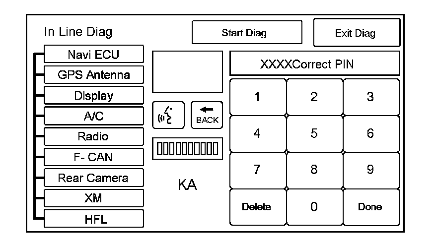 1. Enter this screen by connecting the SCS service connector or by selecting Self Diagnosis Mode from the navigation screen main menu. The message at the bottom of the screen flashes indicating the diagnosis is running. Make sure you enter the audio anti-theft code.