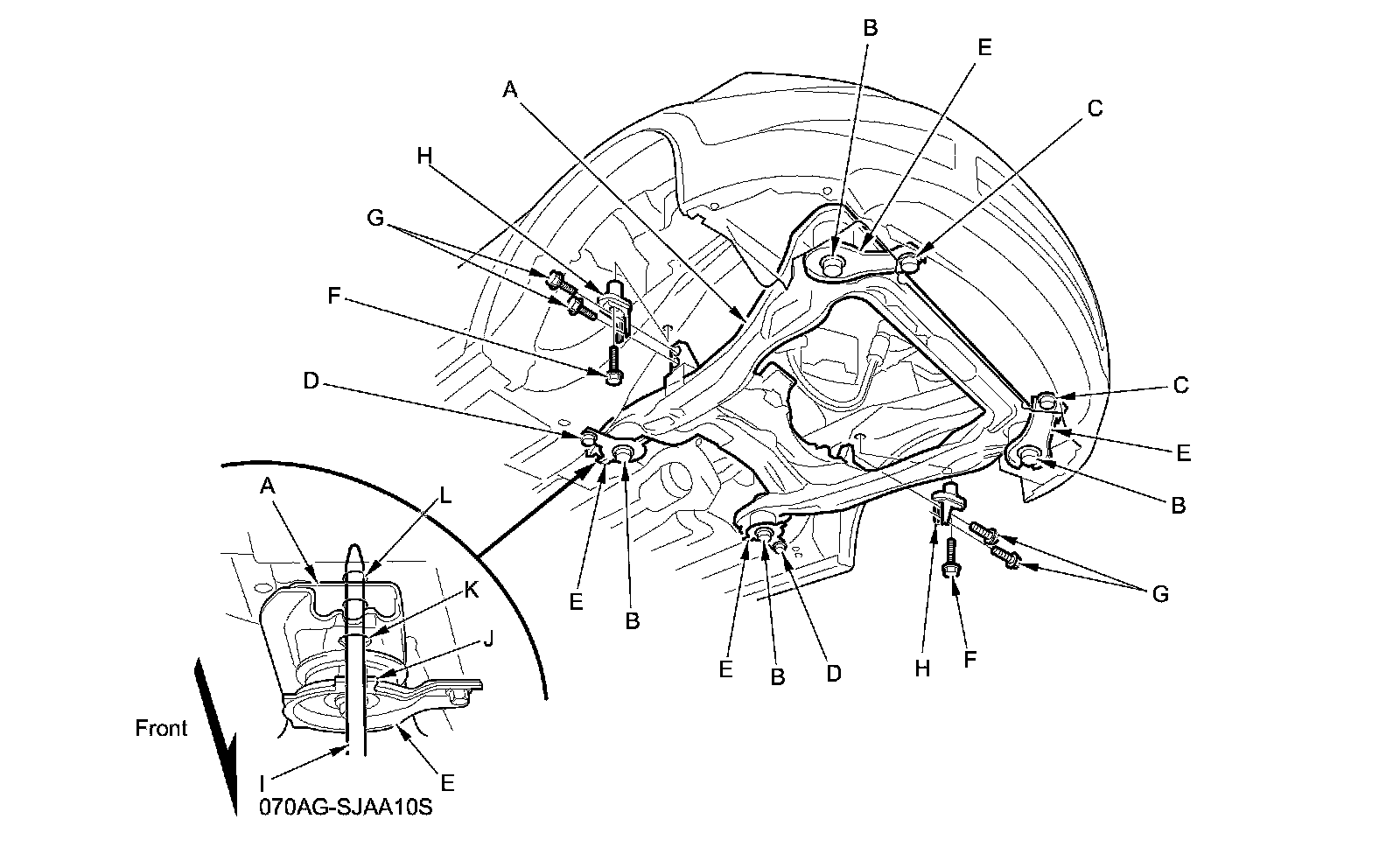 2. Loosely install the new subframe middle mounting bolts (F, G) securing the subframe middle mounts (H).