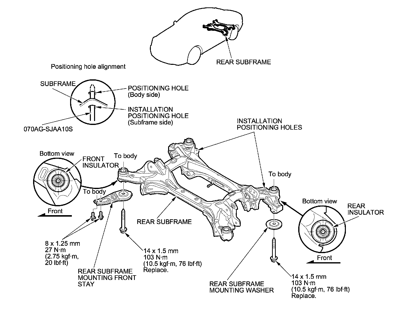 After removing the subframe mounting bolts, the front subframe middle rubber mount mounting bolts, the front subframe rear stiffener mounting bolts, the rear engine mounting base bracket mounting bolts, the rear engine mounting upper base bracket mounting bolts be sure to replace them with new ones.