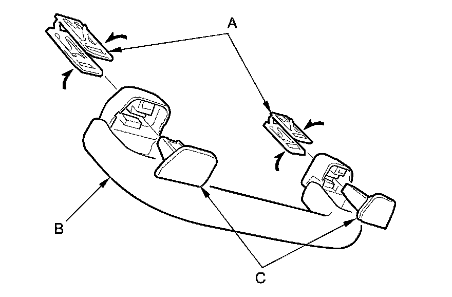 8. Position the grab handle (A) on the grab handle bracket (B), and push on the grab handle until the clips (C) snap into place securely.