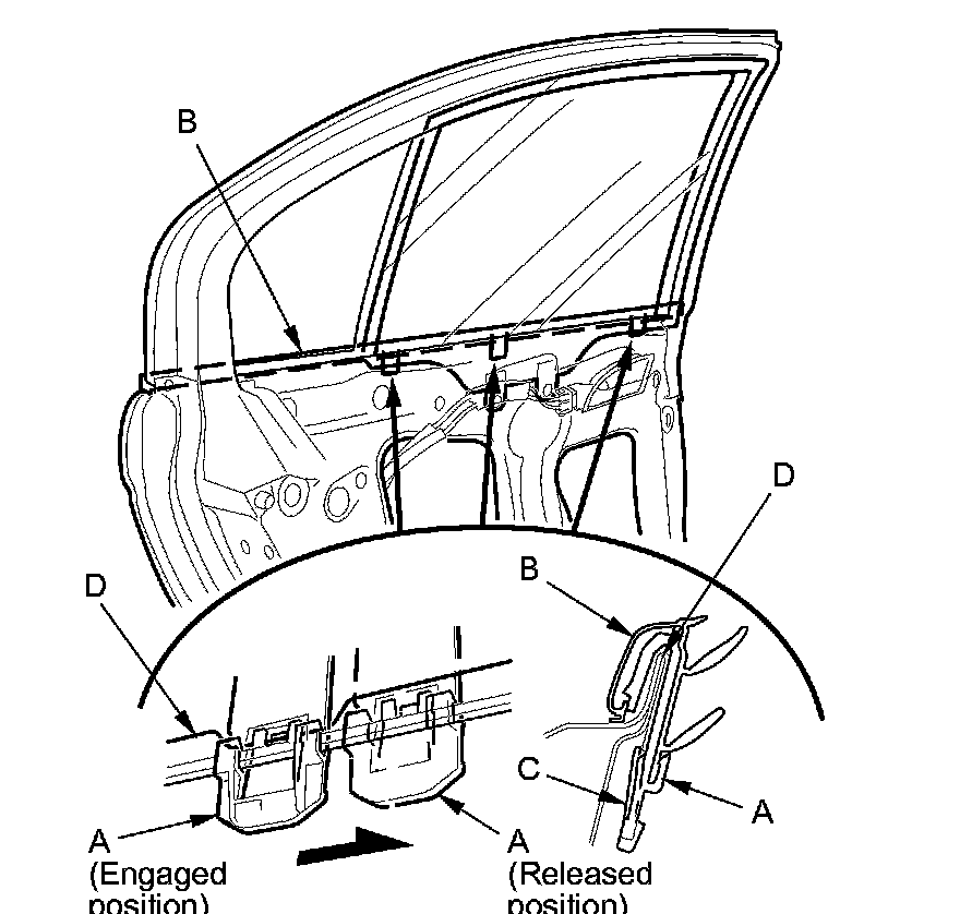 3. From the inside of the door, slide the clips (A) of the door glass outer weatherstrip (B) to release the hooks (C) from the flanges (D) of the door.