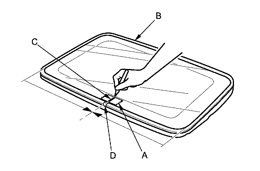 3. Place a mark (C) on the masking tape that aligns with the seam (D) of the weatherstrip.