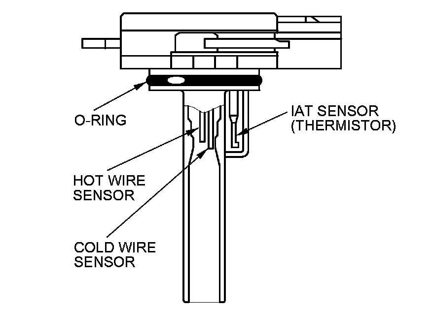 The mass air flow (MAF) sensor/intake air temperature (IAT) sensor contains a hot wire sensor, a cold wire sensor and a thermistor. It is in the intake air passage. The resistance of the hot wire sensor, the cold wore sensor and the thermistor changes due to intake air temperature and air flow. The control circuit in the MAF sensor controls the current to keep the hot wire at a set temperature. The current is converted to voltage in the control circuit, then output to the ECM/PCM.