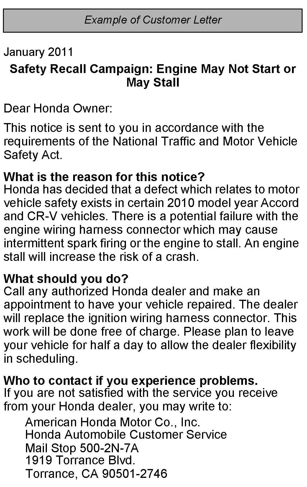 Safety Recall: Loose Wire Terminal May Cause Engine Stalling or No Start (Supersedes 11-001, dated January 15, 2011, to revise the information marked by the black bars and asterisks)