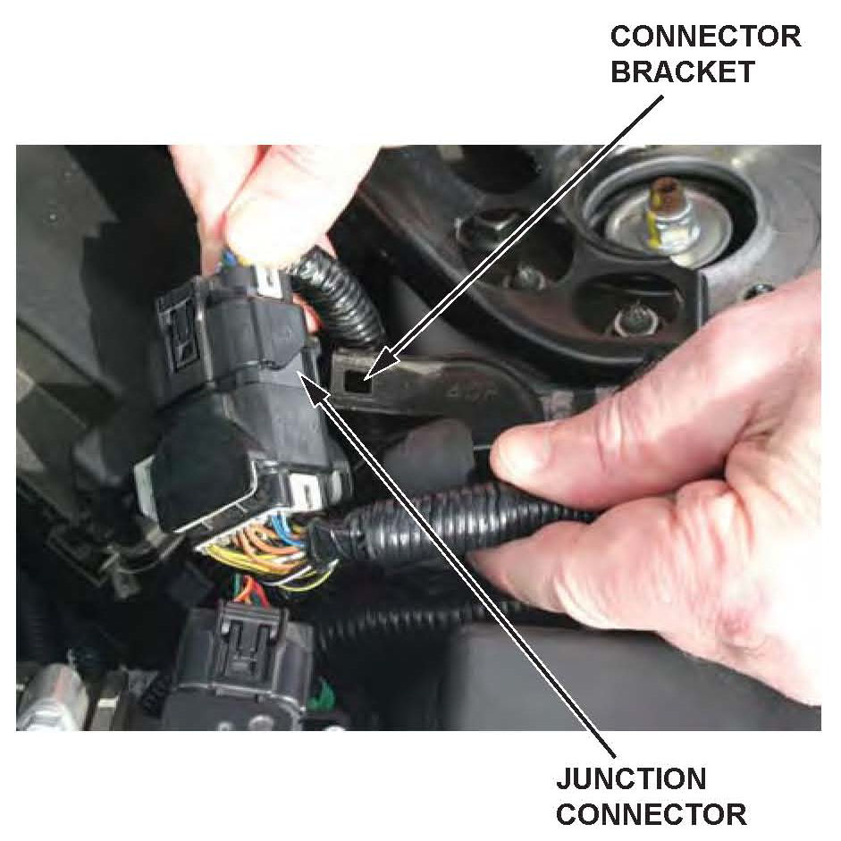17. Connect the engine compartment harness connector to the new junction connector, then attach the junction connector to its bracket on the body.