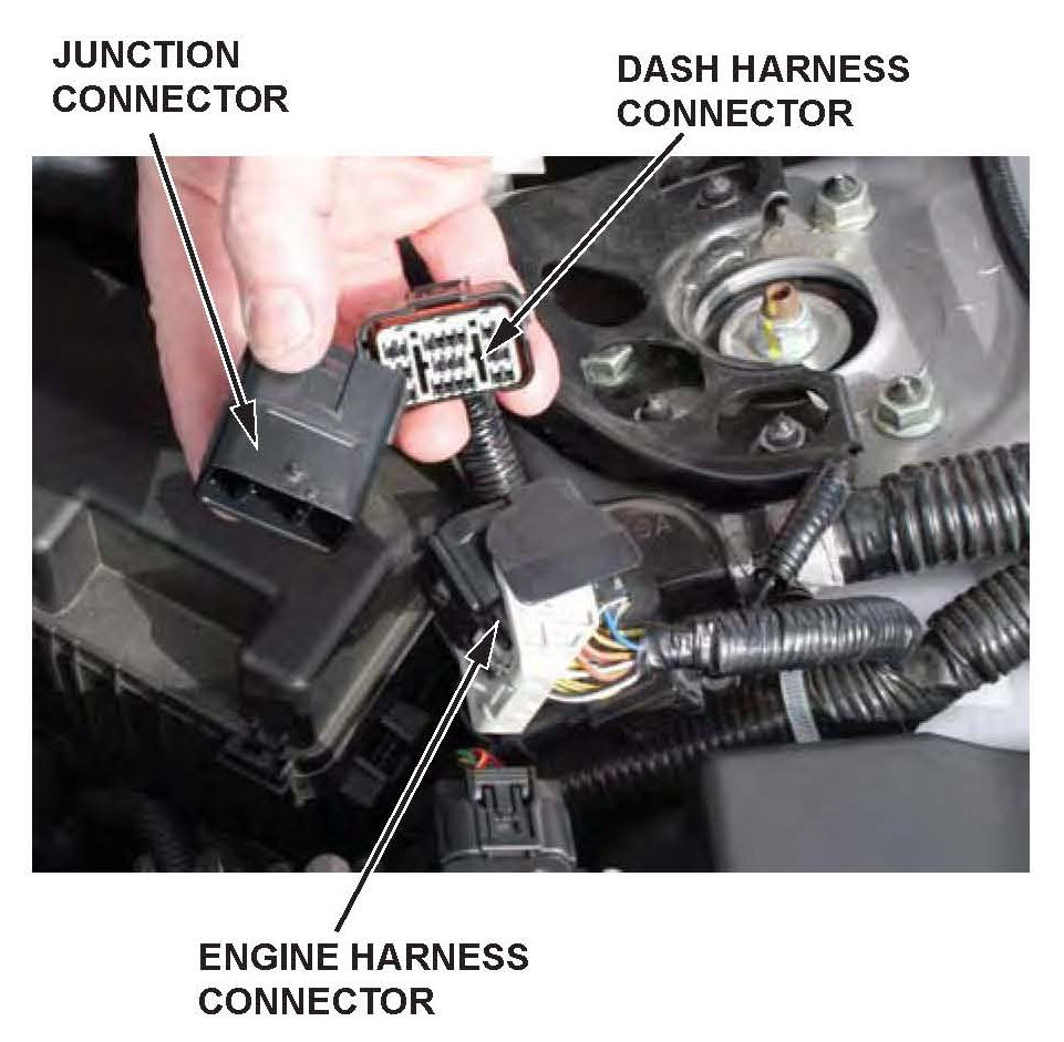 5. Disconnect the dash harness connector from the junction connector, then disconnect the engine harness connector from the junction connector by releasing the engine harness connector cam lock. The junction connector will not be reused.