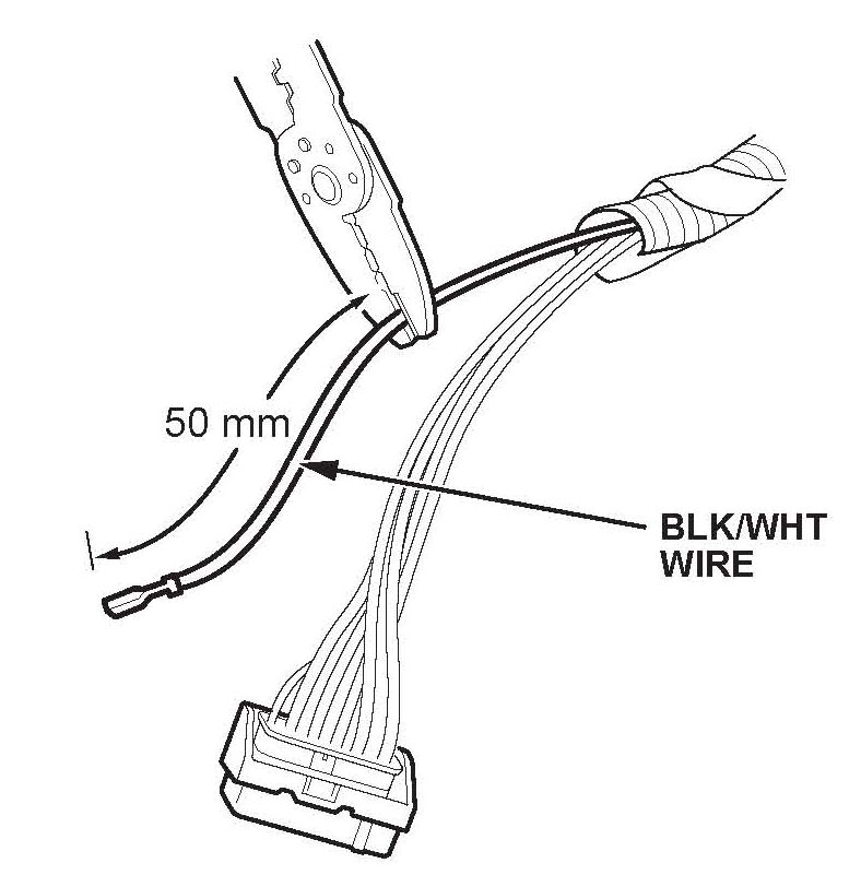 10. Cut off the end of the BLK/WHT wire, about 50 mm from the engine harness connector, then strip off 7 mm of insulation from the end of the cut wire.