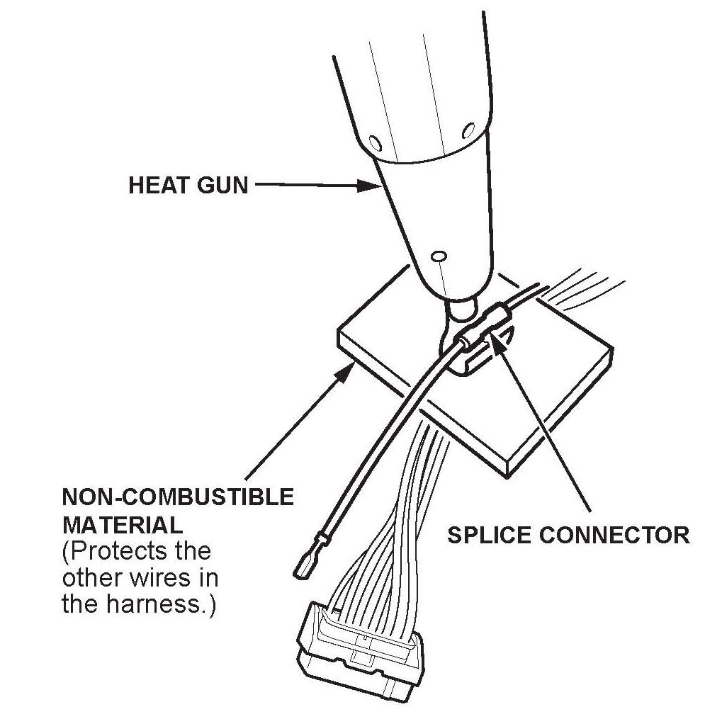 12. With a non-combustible material between the BLK/WHT wire and the engine wire harness, use the heat gun from Terminal Pin Kit C to shrink the splice connector casing.