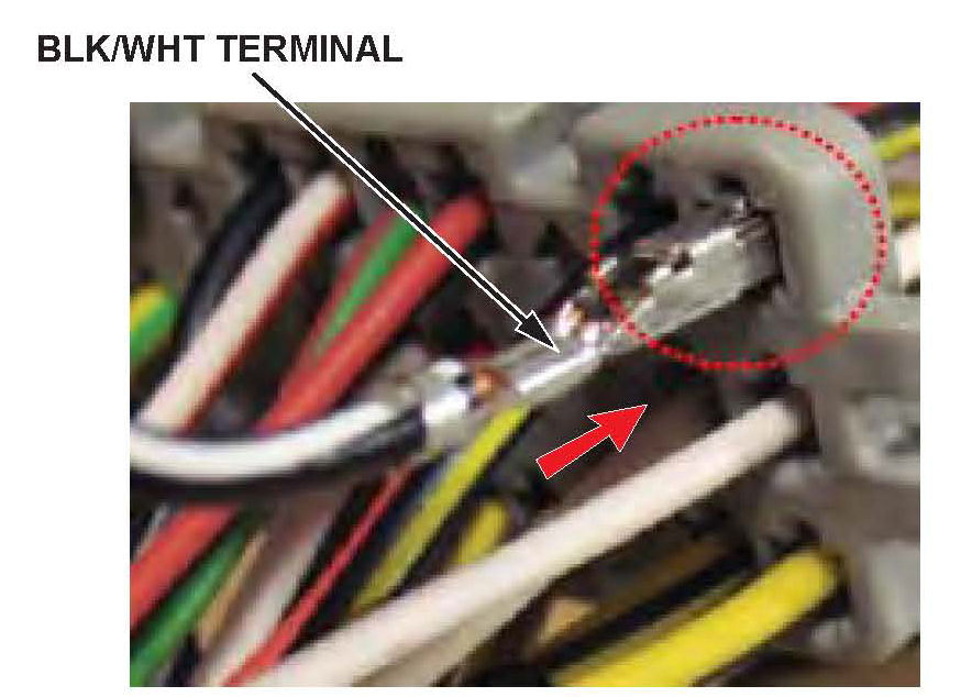 9. Using the Pin Tool P/N 07JAZ-002010A) from the Pin Tool Set (T/N 07JAZ-002000A), gently release the BLK/WHT wire's terminal lock tab while carefully pulling the wire from the connector. Be careful not to damage the lock tab.